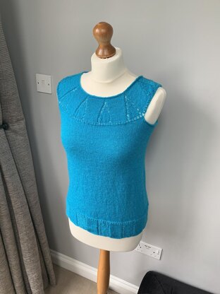 Ladies top that is knitted from the neck down. Starting with a yoke and then once the armholes are formed, the bodice is then knitted in the round with a circular needle. The top is completely seamless so other than attaching a button at the neck, no finishing is required.