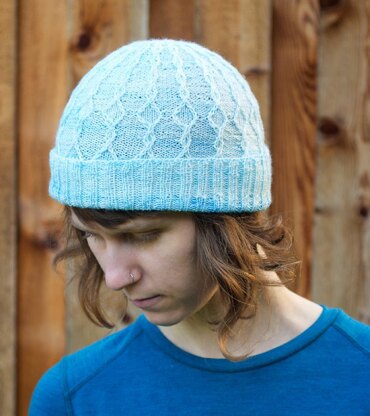 Feather light and delicate, Azurite will make a sweet addition to your wardrobe—or your jewelry box. The gossamer lines of the stitch pattern form a chain of jewels around the crown, creating a semi-precious style that can be worn with the ribbed hem folded up like a beanie, or left long and slouchy. The lovely lightweight fabric keeps you warm without bulk, and the charted and written instructions are delightfully easy to follow.