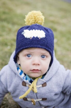 Baa-Baa is an earflap hat which features a darling sheep intarsia motif, simple colorwork at both the crown of the hat and at the earflap ends, icords (to make sure the littlest ones keep their hat on) and a perky pom-pom to top it off. The hat is knit flat to accommodate for the intarsia motif.