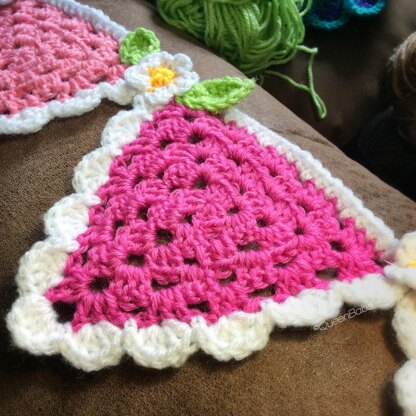The 11 page pattern includes two variations to make the pink bunting style with scallops on two sides and to make the Holly Jolly bunting with scallops on all three sides.