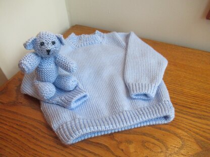 This perfect duo of jumper and teddy baby bear toy will delight any baby from birth to 12 months old. Knitted in soft 4 ply, it is perfect for any time of year.