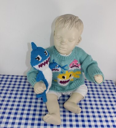 This is my Baby and Toddler Shark Family Sweater and Toy knitting pattern. My grandson Gus LOVES this sweater and toy. He calls them baby shark, mummy shark and daddy shark. The sweater has the shark family faces on the front as can be seen in the photos. The sweater is worked flat on 4 mm needles in any dk(8 ply) yarn of your choice. The knitting pattern provides full instructions for 4 sizes S (6-12 months), M (12-18 months), L (18-24 months) and XL (24-36 months). There are step by step photos to help you throughout and colour charts for the intarsia work. The toy shark is 12 inches and worked flat on 3 mm needles in the leftover wool from the sweater. This set makes a fabulous gift for any baby or toddler. You can buy this madmonkeyknits pattern here as an immediate pdf download.
