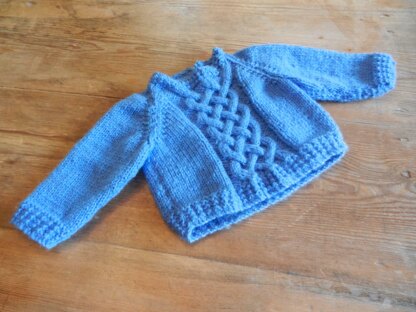 A lovely aran style baby's jumper using soft Double Knitting/Light Worsted yarn.