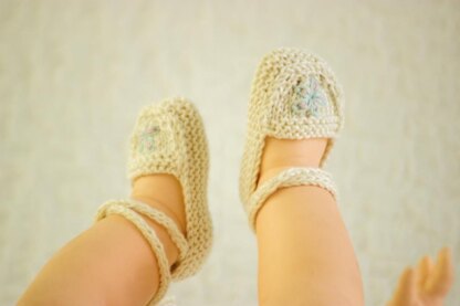 This is a pattern for an adorable pair of knit Ballet Shoes. Treat the special little baby girl in your life to a pair of romantic ballet shoes! A very easy project, suitable for beginners. Makes a great gift. They feature a garter stitch sole and sides and a lovely simple flower embroidery. Experiment with different colours and also try them in wool. Why not make a few pairs to go with different dresses?