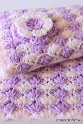 Baby blanket crocheted from Baby Yarn 100% acrylic. 2 colors yarn (pale pink, lilac). Feel free to mix and match different colors to create your own unique touch.