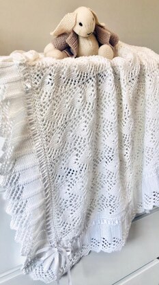 Knitted in a beautiful soft cotton, this beautiful blanket is sure to become a family heirloom. Ribbon trim can be changed to any colour making this suitable for baby boy or girl. Would also make an exquisite Christening shawl. Looks complicated however is really quite simple to knit, suitable for the intermediate knitter.