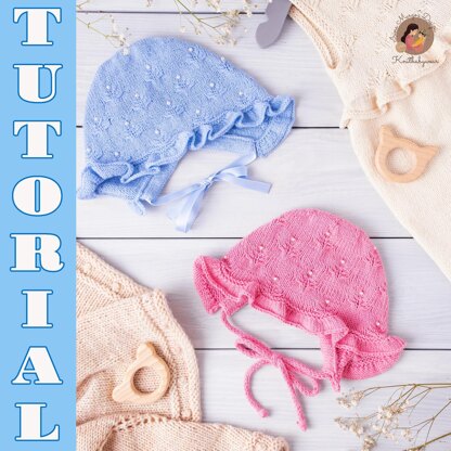 Bonnet is worked flat in one-piece. It’s made front to back and decorated with an original frill and a fantasy pattern. The bonnet can be joined with a knitted cord (i-cord), inserted into a knitted brim. To make this pattern easier to follow, the sizing instructions are color-coded