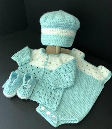 The garments in this crochet pattern are designed to fit an infant from newborn-3 months. The 5-piece outfit is made with sports weight baby yarn (# 3) using Size F and Size E crochet hooks. You will need approximately 700 yards of yarn and 10 buttons.