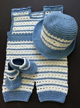 Baby boy's crocheted romper with hat and loafers. Made with #3 crochet cotton thread.