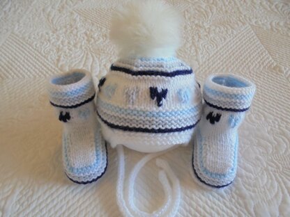 Baby Boy Hat And Booties Set - Hat Pattern Makes Three Sizes 0 to 6 6 to 12 and 1 to 3 Years. Booties Pattern Makes Three Sizes Pre Walkers 0 to 3, 3 to 6, 6 to 12 Months. Made on Two Needles