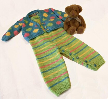 These baby dungarees and cardi are really practical and full of fun. The dungarees undo at the legs making nappy (diaper) changing really easy and the back has cross over straps that button on the front.