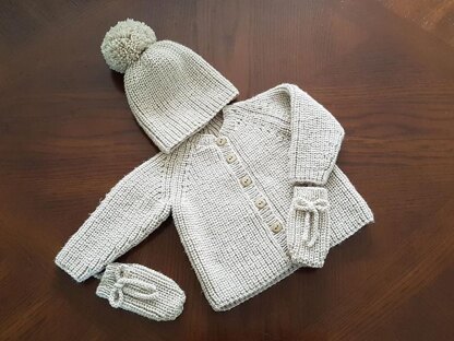 Materials: Jacket: James C Brett Supreme Baby 4 ply 2(3) x 100g balls [440 m/482 yds]; OR Sirdar Snuggly 4 ply 3(4) x 50g balls [226 m/247 yds]; pair 3 mm needles; pair 3¼ mm needles; 5 small buttons; stitch holders. Hat, Bonnet & Mitts: James C Brett Supreme Baby 4 ply 1(1) x 100g balls [440 m/482 yds]; OR Sirdar Snuggly 4 ply: 1 ball [226 m/247 yds]; pair 3 mm needles and 3¼ mm needles; 1 small button for bonnet; length of narrow ribbon for mitts
