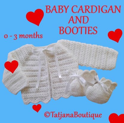 Crochet Pattern baby cardigan and booties set decorated with satin ribbon. ♥♥♥ Cardigan & Booties size 0 - 3 months. The pattern is written in US crochet terms but with a conversion at the beginning of the pattern to UK / Australian terms. Its just that some of the names of the stitches are different. Materials & tools you will need: ★ Acrylic or other yarn in white colour approx. 130 gr - DK, Double Knitting in UK, Light Worsted in the USA, 8ply in Australia. ★ Crochet hooks sizes 4 mm and 5 mm. ★ Satin ribbon in white colour 1.7 m (1 cm wide)