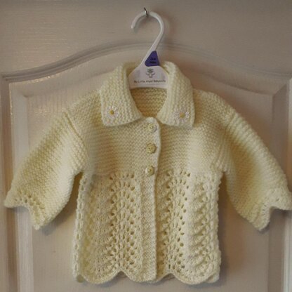 It is very easy to knit and the instructions are clear and straightforward. This project can be knitted in one colour or the body can be knit in one colour and the top and sleeves in another This pattern would be an ideal for a novice knitter as the pretty lace pattern has only 4 rows to it and three of the rows are either knit or purl. The lace pattern itself is very easy to remember. All my patterns are easy to knit and I hope will give confidence to those starting out on their knitting journey. This would make a great baby shower gift.