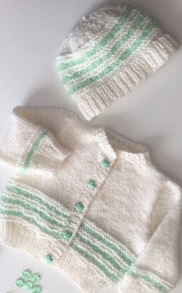 This cute little set knits up quick as it uses only knit and purl stitches. Worked in one piece to the armhole. The sleeves are shaped rather than raglan, so they are eased in when sewing up. Worked flat on two needles. The beanie is worked flat with a seam. Try this in shades of blue and brown for an autumn look