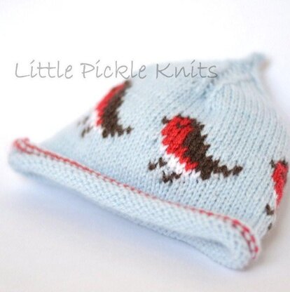 Little Pickle Knits by Linda Whaley. Knit this pretty Little Robin Pixie Beanie to keep your little one cosy and warm this winter. An adorable beanie hat that little girls will love to wear! These festive robins are worked flat on 3.25mm (US3) single pointed needles for easy intarisa knitting. The beanie shown here was knitted with Bergere De France Caline. The very popular Debbie Bliss Baby Cashmerino is also recommended for this pretty little Christmas hat.