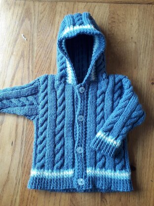 Baby hoodie, age 6-9 months, chest 18-20", suitable for boy or girl Yarn required - approx 120g main shade, 20g contrast A, 10g contrast B