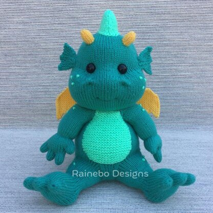 This sweet Baby Dragon is knit in the round, (Intermediate Level), using Magic Loop or double pointed needles. The body, legs, arms and head are all knit on as you work along. The belly cover, tail, spines, horns, head frills, wings, and warts are added later. He sits approx. 12” tall (including spine) and is created using approx. 360 yds. of #3-light wt. (DK wt.) yarn: Main Color Yarn…270 yds. (Red Heart Baby Hugs Light- Aloe), Contrast Color A Yarn…60 yds. (Red Heart Baby Hugs Light- Sprout), Contrast Color B Yarn…30 yds. (King Cole Pricewise DK- Gold). • Size 3 (3.25mm) 32” Circular Knitting Needles (if using Magic Loop) or Double Pointed Needles • 15mm Safety Eyes (or embroidery thread/yarn) • Ring Stitch Markers & Removable Stitch Markers • Large-Eyed Blunt Needle & Long Straight Pins • Polyester Fiberfill Stuffing