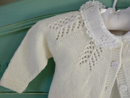 This delightful jacket has a touch of lace in the yoke to provide charm and keeps the knitter’s interest. It is worked seamlessly from the top down in one piece to the underarm, where the body and sleeves are then worked separately. The button bands are worked together with the rest of the knitting. The instructions place the buttons on the left side, typical for baby girls, but the design would be appropriate for baby boys too – just remember to make the buttonholes at the beginning of those rows instead of at the end.