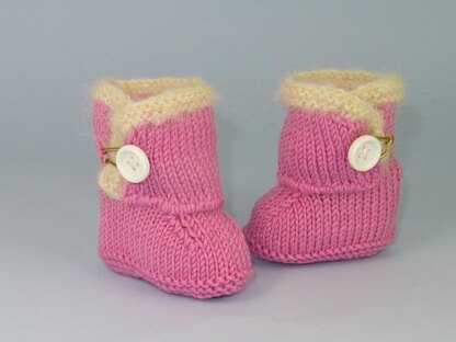 This is my Baby Fur Trim One Button Booties knitting pattern. These fabulous booties are quick and easy to make being knit entirely in one piece on 2.75 mm needles in any 5 ply or dk (8ply) yarn of your choice.