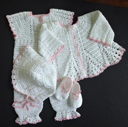 Coming home outfit for baby girl featuring jacket, romper, bonnet, and booties. Fits up to 12 pound infant.