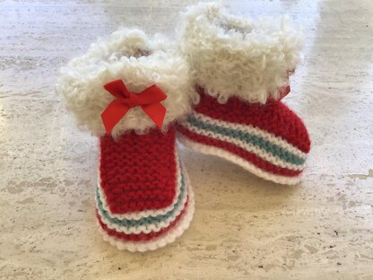 Adorable Baby Girl Santa Booties - Quick And Easy Pattern Makes Three Sizes 0 to 3, 3 to 6, 6 to 9 Months. Made on Two Needles in on Piece.