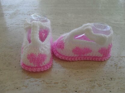 Really Cute Baby Girl T Bar Heart Shoe This Pattern Is Quick And Easy Makes Three Sizes of Shoes 0 to 3, 3 to 6 and 6 to 9 Months. Made on Two Needles in One Piece Working From The Sole Upwards Made in DK.