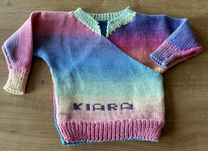 Ein Freund wird unerwartet noch einmal Vater. Daher wird schnell aus dem Garnvorrat ein Kimono-Pullover für die kleine Kiara gestrickt. Damit sich die Mühe lohnt, habe ich den Sweater in Größe 86 gearbeitet, so dass es für das im August geborene Kind im zweiten Herbst passen wird. Die Arbeit erhält zudem vorne den Namen des Kindes, so dass das Geschenk wirklich ganz persönlich ist. Wer den Pullover nacharbeiten möchte, findet das ABC für seinen Wunsch-Namen beiliegend.