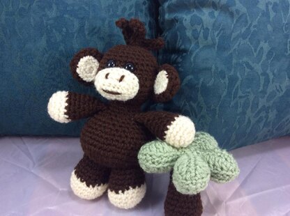You will need the following to complete your project: Red heart super saver: frosty green (palm tree fonds - small amount) Red heart super saver: coffee - use for the monkey and palm tree trunk and the nares and mouth of the monkey (approximately 100 grams) Red heart super saver : aran -used for the hands, feet and muzzle - (small amount) 4 mm crochet hook polyester stuffing 1 pair of 12mm safety eyes stitch markers straight pins for securing pieces before sewing