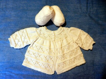 Knitted in soft and feathery 3 ply yarn, this matinee jacket is super soft and light, perfect for a newborn baby up to three months old. The pattern, maybe not suitable for an absolute beginner is nevertheless, not too complicated, so suitable for someone with just a little experience and confidence.
