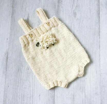This cute, aran weight romper has a lamb worked into the front section. The romper is worked mostly in stocking stitch with 2x2 rib hems. The romper is knitted in one piece & fastens with buttons at front that can be adjusted to secure the fit. The lamb is created by using loop stitch and then the face and legs are embroidered in contrast yarn.