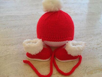 Baby Santa Hat And Booties Set. Made On Two Needles In Double Knit. The Hat Pattern Makes Four Sizes 0 to 5 Years. The Booties Are Pre Walkers Three Sizes 0 to 3, 3 to 6 and 6 to 9 Months Unisex.