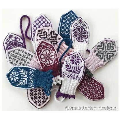 The mittens also have a crocheted picot edge along the bottom of cuff. This can be replaced by knitting a longer cuff. Chart and written instructions for crocheted edge is included.