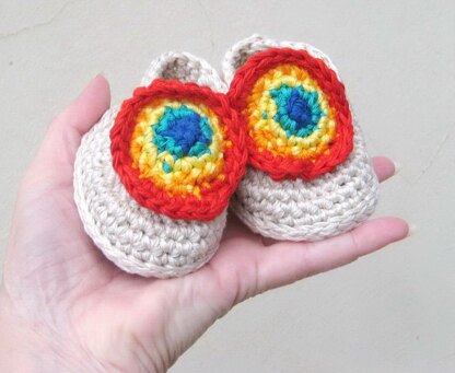 Rainbow baby slippers is a perfect baby shower gift. You can make it from cotton, or acrylic yarn. Pattern is written in English, U.S. terminology. This pattern includes step by step instruction and very detailed photo tutorial. Basic skills of crocheting are needed.