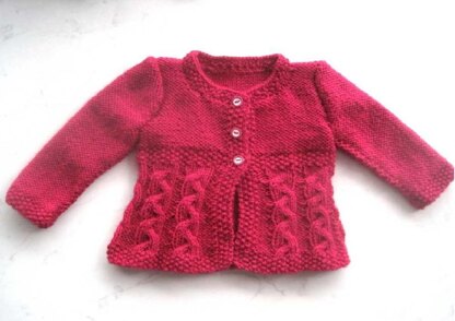 Baby Sofia is a gorgeous cabled cardigan/jacket which looks so smart. It buttons down to the waist where it flares out to form a slightly flared skirt with cute cable plaits all around.