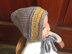 This cute bonnet and booties set is a quick make. They are knit flat on two needles with only one seam using two contrasting colours. The bonnet has a striped brim with garter stitch borders, a stocking stitch body, garter stitch at the neck and again for the ties. The booties have a cuff design that helps them stay put! They have a garter stitch sole and sides, a stocking stitch instep and a ribbed cuff, the cuff fold-over has stocking stitch stripes bordered by garter stitch.