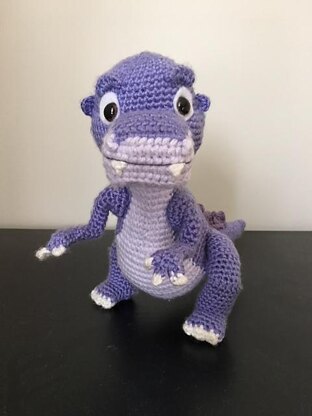 Cute crocheted baby t-rex dinosaur plushie. (popularized by Chomper of Land Before Time) Toy measures 9 inches from snout to tail and 9 inches tall. Attention given to include fine details to make it look cute and adorable