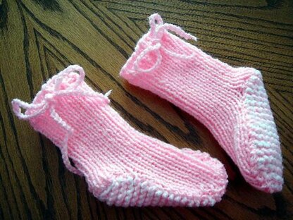 A great pattern for warm feet! Fits from 4 to 9 months! These have a nice fitting double thick sole to keep baby's feet extra warm. The pattern is fairly easy, so you can make a lot of these in different colors. This is a well received gift at baby showers! Uses worsted weight yarns, and US # 8 needles. Great fun to knit, and goes quickly too!