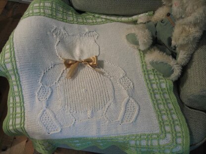 For the blanket you work the center teddy bear picture first, then pick up stitches all the way around to work the border. A Provisional Cast On is used, so that those edge stitches are live and you don’t have to pick them up. If you do not want to do a Provisional Cast On then use a Cable Cast On, because this cast on will allow you to see the stitches easier for the pick up. I added a double YO at the neck so you can tie a ribbon around his neck.
