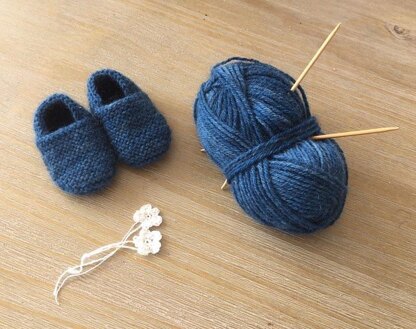 These cute little slippers are knit in one piece using dk yarn, with only a couple of little seams to sew up to complete.
