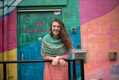 A super quick bulky pontini with a bit of pizzazz! Spring and summer always mean bright colors are coming, and this sample represents all things bright. However, knit up in jewel tones this pontini would make a great fall piece for keeping the chill off your shoulders when the temperatures start to dip. Slip stitches in the lower half provide texture and horizontal movement while corrugated ribbing on the top half give vertical stripes that highlight the face. Throw this pontini on over an everyday t-shirt and jeans and leave the house looking put together and fun but layer it over a dress or blouse with slacks and you’ve got a dressier look for an evening out. This small poncho is available in kit form from Queen City Fibers; check out their Etsy shop for colorways.