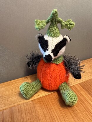 This is a pattern for a little badger dressed in his pumpkin Halloween outfit. He can cover a chocolate orange or plastic gift bauble, or, you can stuff him and knit a garter stitch base and use him as a hanging ornament or soft toy.