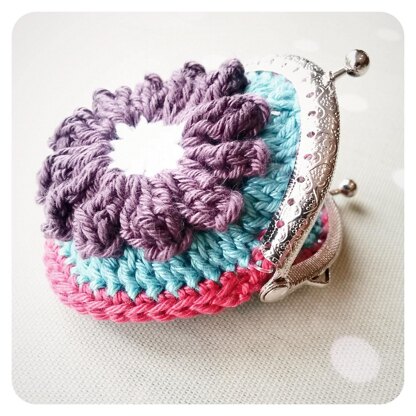 Requirements: 4mm crochet hook, darning needle, DK cotton yarn (4 colours), 7cm arched purse frame