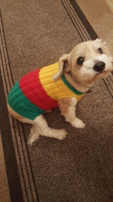 This is a lovely knitted jacket for our furry friends to keep them cosy and warm in the colder months. Knitted in double knitting yarn is easy to knit and knits up quickly. Ideal for the beginners out there. This beautiful little jacket will brighten up those dark winter months. Your furry friend will love you even more. This is my little dog Bailey who I made it for. He’s a little camera shy. Bless him. He does love his jackets though.