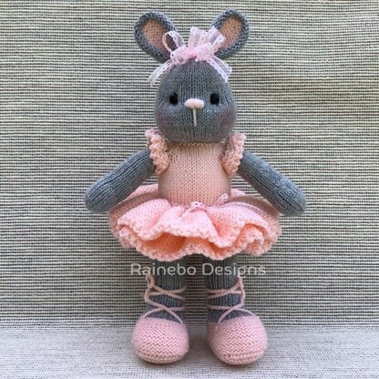 This darling Ballet Bunny is knit in the round, (Intermediate Level), using Magic Loop (or double pointed needles). She is approx. 12” tall (without ears), and is created using #3-light wt. (DK wt.) yarn and size 3 (3.25mm) 32” Circular Knitting Needles (if using Magic Loop). The legs, body, arms, and head are all knit on as you work along. The clothes are not removable. Approx. yardage: Body Color: 120 yds. (Cygnet DK-Lt. Grey 195) Tutu Color: 200 yds. (Cygnet DK-Flash 159) Ear Contrast Color: 30 yds. (Cygnet DK-Flash 159) • 10mm Safety Eyes (or embroidery thread/yarn) • Head Decorations: Ribbon • 2.25mm Crochet Hook (for shoe laces) • Yarn/Embroidery Thread for Nose • Large-Eyed Blunt Needle & Long Straight Pins • Removable Stitch Markers & Ring Markers • Polyester Fiberfill Stuffing