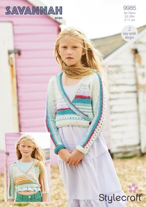 These ballet style cardigans are not only sweet but are also easy to knit. The cardigans wrap around and secured with a button. We love the detail of eyelets adorning the sleeves and the lower body, finished off with a garter stitch border.