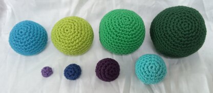 After making a lot of amigurumi items that had ball shapes in them, I realised that there was a simple mathematical way of working out how to get whatever size ball I was trying to make, more or less, knowing how many rows were needed between the shaping for the top and bottom of the ball (sphere). The first eight sizes are here in full, after that I tell you how to continue if you want to make larger ones. Don’t worry, you won’t have to do more than count and maybe divide an even number in half! So here you have a pattern you can use to make a huge number of different sizes of ball or sphere with whatever yarn you have to hand – although I do recommend a firm one, such as a cotton, if you want a fairly accurate sphere. It’s also a good way to use up leftovers – I include how to work out how big a ball you can make with the yarn you have, although you WILL need to do some maths for that.