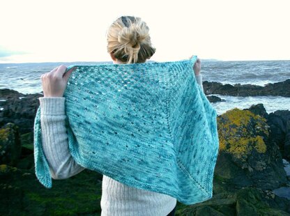 Ballyholme is a cozy worsted triangular shawl that is knit top down with gradient eyelets that start from the top and gradually fade as you knit down the shawl ending with a garter stitch border.