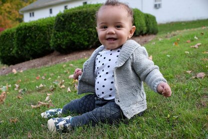 Cabled twists lace the body of this layering cardigan. • Sweater is worked from the bottom up in a not-too-heavy weight fabric, making it suitable for transitioning weather and warmer climates. It features an easy charted textured stitch pattern, raglan detailing and a cozy shawl collar worked with short rows. • Pattern is written for adventurous beginner to intermediate knitters; no cable needles are necessary. Shown in Size 12 months with 1”/2.5 cm positive ease. This sweater is shown fitted, size up for more room to grow.