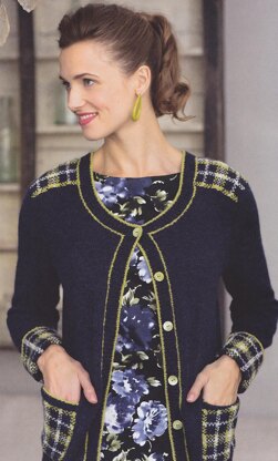 This cardigan was inspired by the deceptively simple lines of classic Chanel jackets. The main sections of this cardigan are in stocking stitch with rib side panels and so are simple and quick to knit. The tartan details are worked as a combination of stranded work and bobbins - basically a combination of intarsia and Fair Isle - and so do need knowledge of these methods. This cardigan is shaped at the bust with short row shaping and at the waist but if you prefer more room in this area, omit the front and back waist darts. The original yarn seems to be discontinued but Blacker Yarns British Classic 4ply seems a good substitute but check with a swatch.